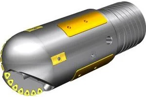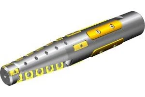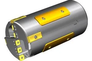 Telibefúró, cserélhető keményfém lapkákkal és vezetőlécekkel.