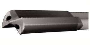 Tömör keményfém telibefúró szerszám, veseformájú hűtőcsatornával. |